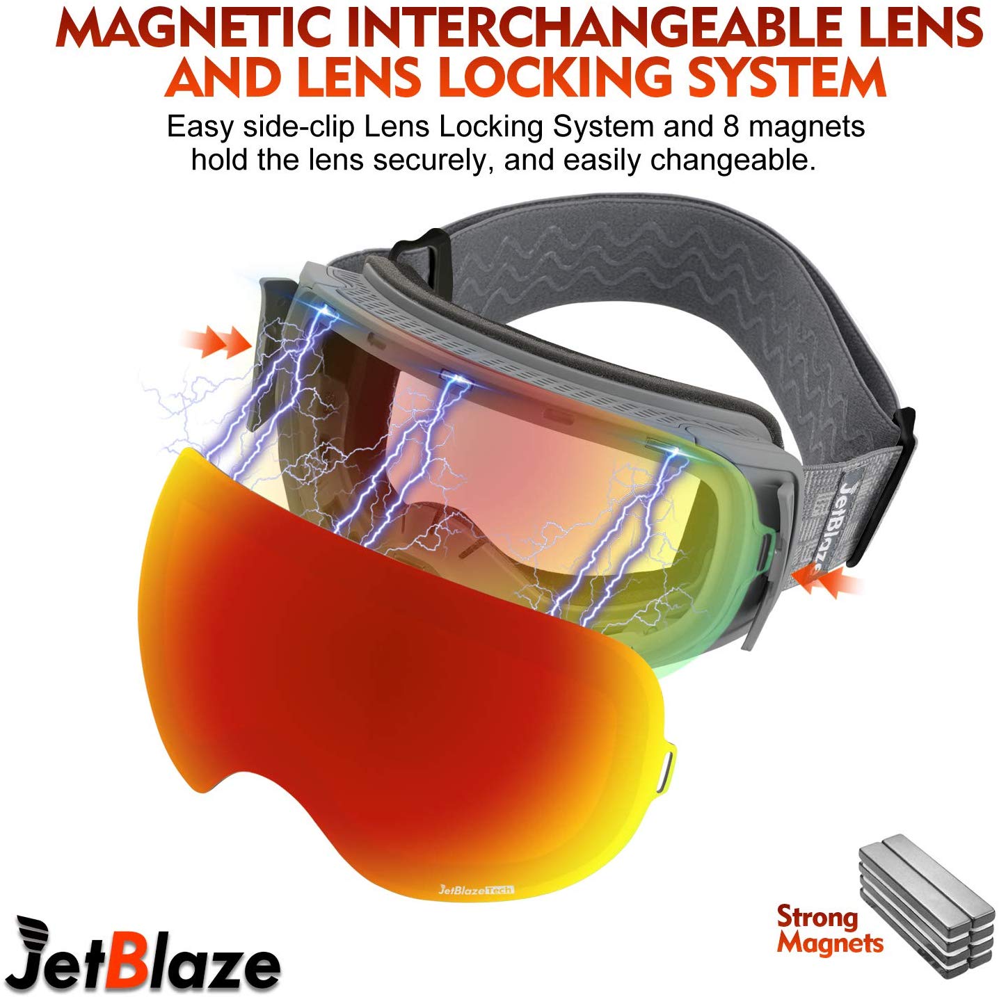The extra large Spherical lens is secured by 8 magnets under a stabilization bezel to offer peripheral view and excellent optical clarity.